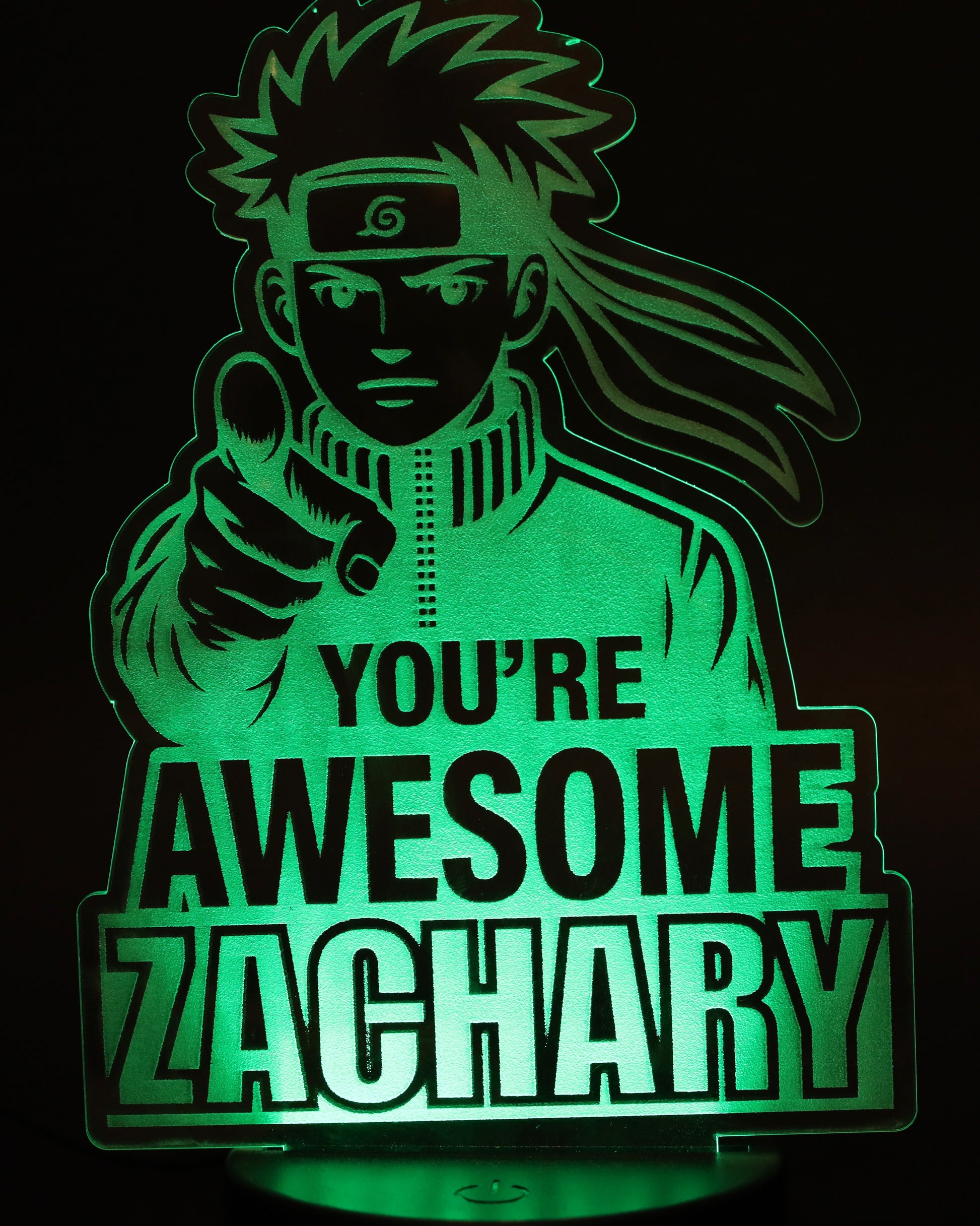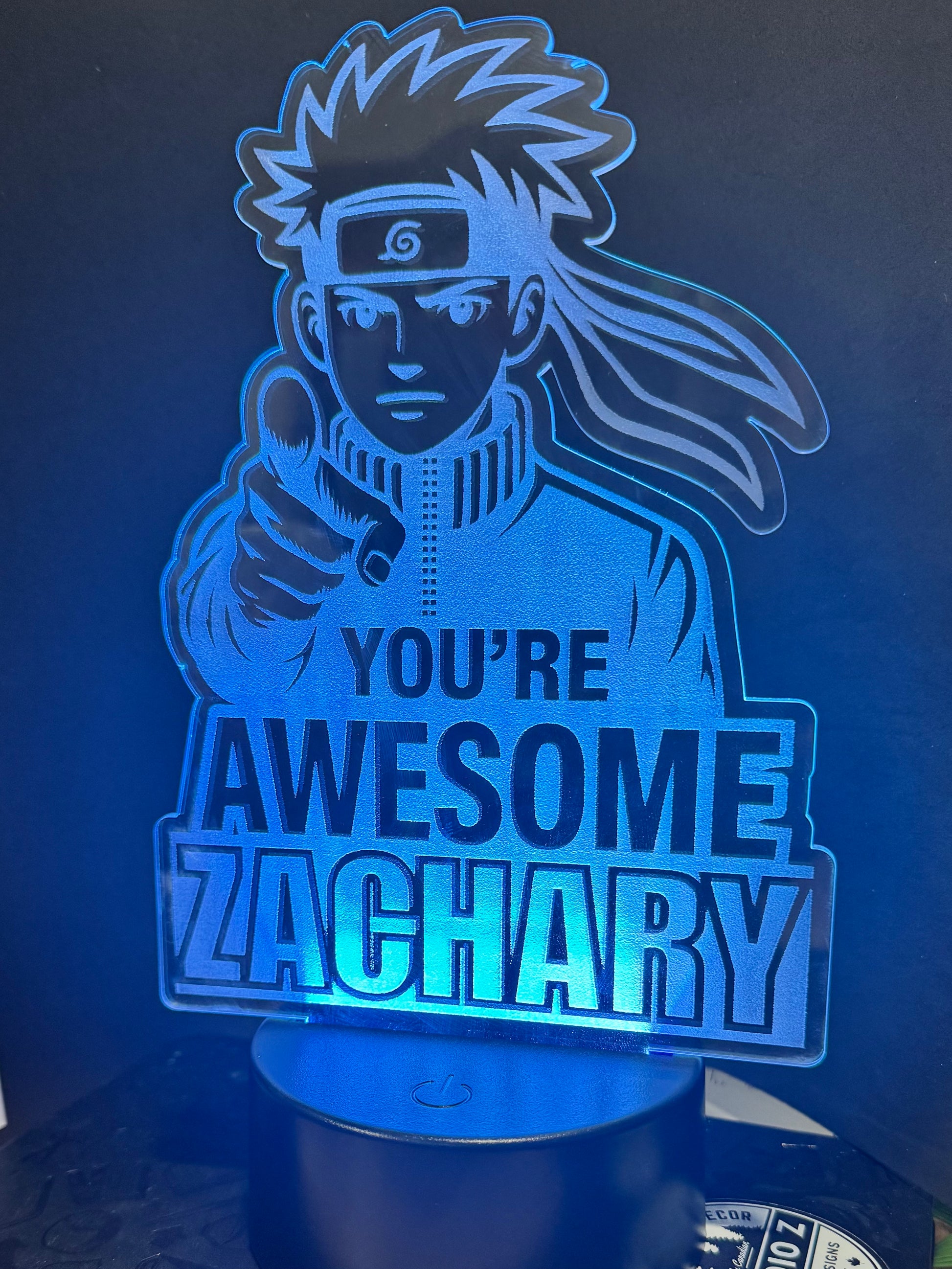 Laser cut and engraved 3mm clear acrylic with LED light. You choose the graphic, name, etc. Available with unfinished wood LED or black/white colour changing puck-style LED base